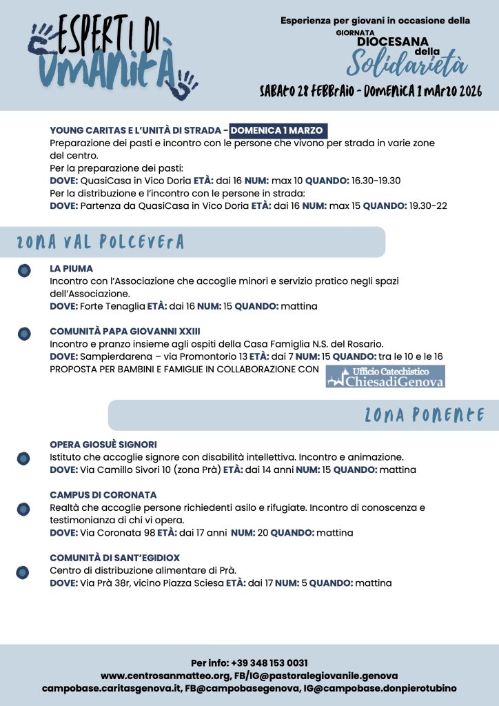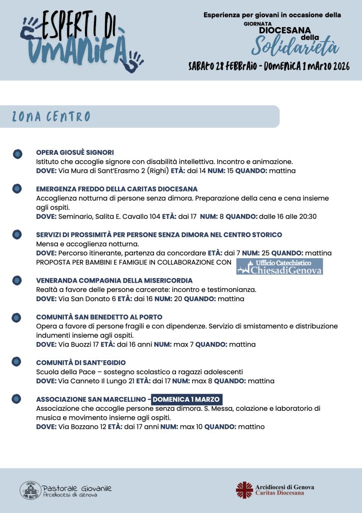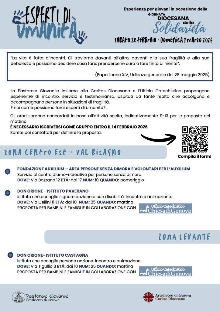 La Pastorale Giovanile insieme alla Caritas Diocesana e all’Ufficio Catechistico della Diocesi di Genova propongono esperienze di incontro, servizio e testimonianza, ospitati da tante realtà che accolgono e accompagnano persone in situazioni di fragilità.